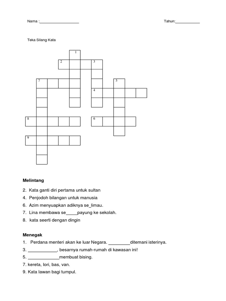 Teka Silang Kata Tahun 2 : 0 ratings0% found this document useful (0 votes).. Teka teki silang menyajikan sebuah permainan berbahasa indonesia dengan kekayaan kata yang berlimpah. Crossword puzzle in bahasa malaysia. Copy of teka silang kata bab 2 seni lukisan psv tingkatan 3 disediakan oleh: Crossword puzzle in malay language. Use the download button below or simple online reader.