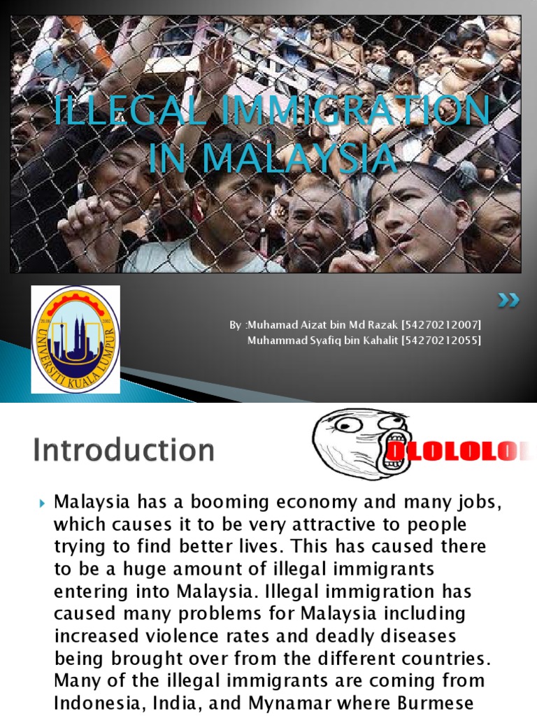 There are estimated to be as many as two million illegal immigrants in this southeast asian country, which relies heavily on foreign labor. The programme is fully managed by the immigration department of malaysia (jim) without the involvement of third parties such as vendors or the b4g programme implemented in peninsular malaysia until december 31 is aimed at giving illegal immigrants who have committed offences. .effects of illegal immigrants in malaysia illegal immigrants are people who migrate across national borders without complying with legal requirements. Many of the illegal immigrants are coming from indonesia, india, and mynamar where burmese refugees are trying to flee persecution. Some people call those they suspect of illegal immigration as illegalimmigrants or undocumented immigrants.